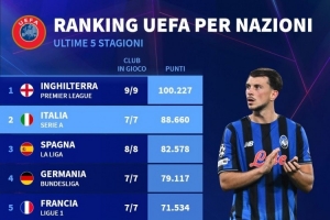 体育资讯11月6日讯 德国转会市场列出了各国联赛的欧战总积分排名,英超居首,意甲、西甲二三位。