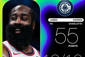 哈登年满36岁连续5场场均轰38.4分&总计192分 打破詹姆斯纪录!
